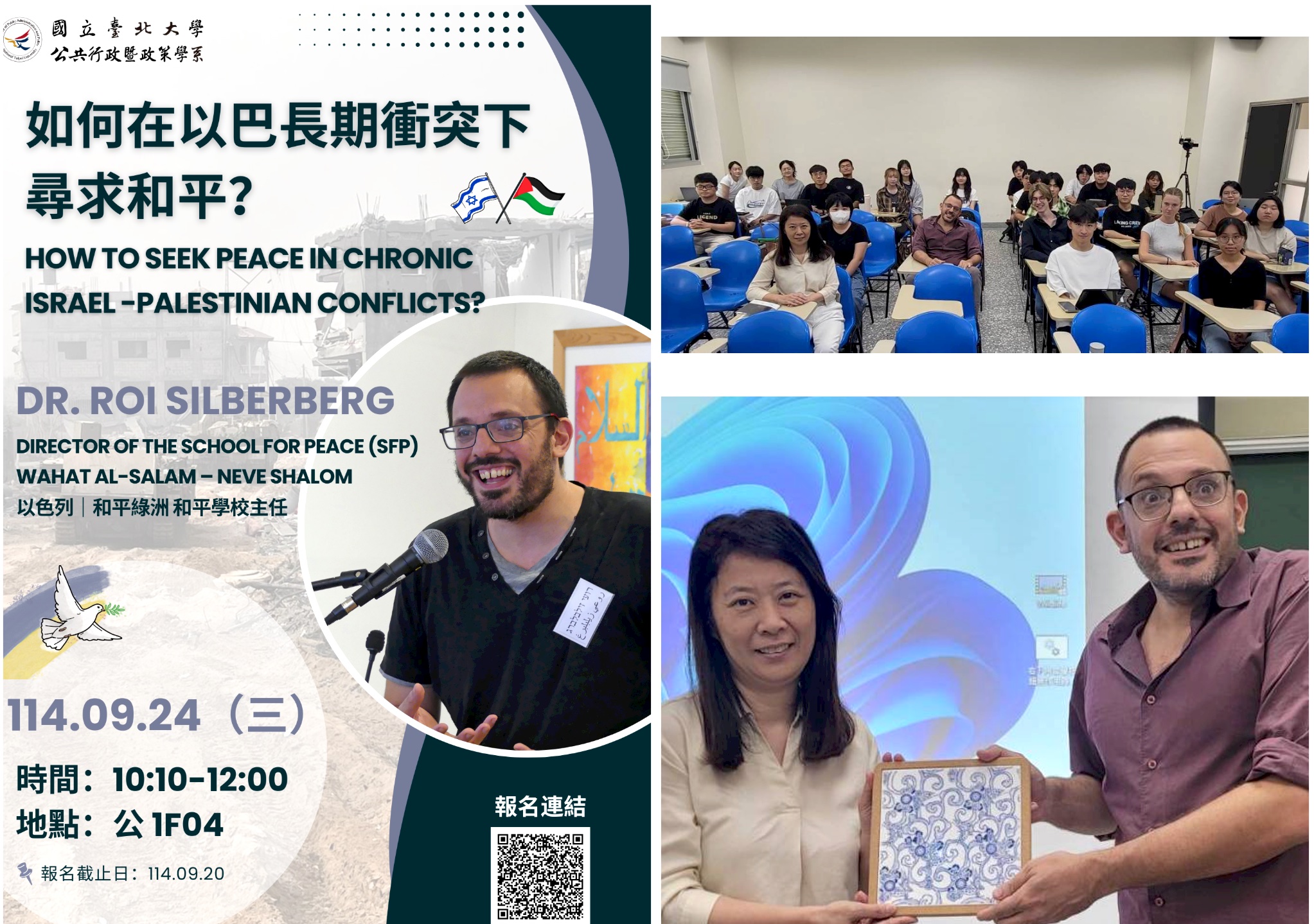 2025年114學年上學期 羅至美老師的歐洲統合導論課程很高興透過龍應台文化基金會Taiwan Peace Fellow 校園合作,邀請到以色列學者Dr. Roi Siberberg ,與同學分享他對以色列-巴勒斯坦衝突的獨到見解。Dr. Siberberg以「如何在長期以巴衝Read More…